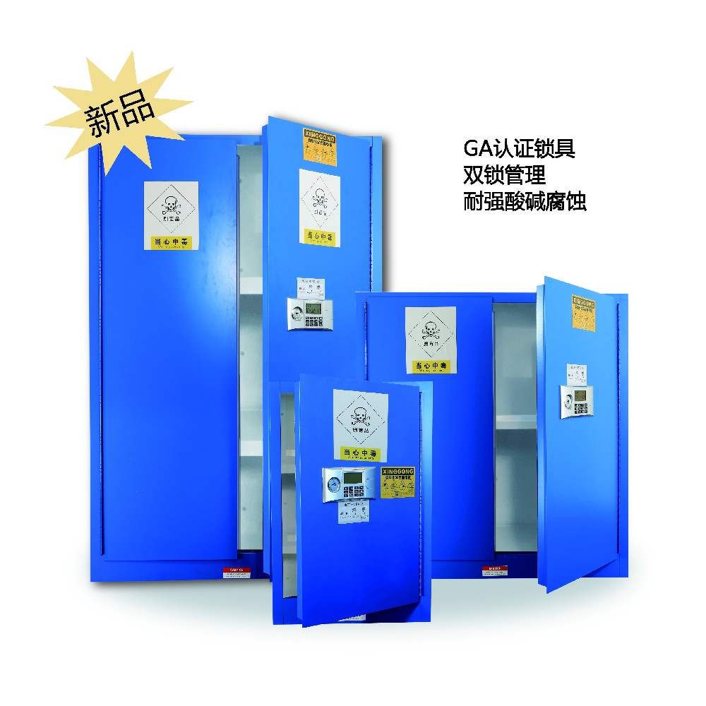 3. 独特设计的三点联动式门锁装有电子密码锁(*锁具需符合《GA374-2001电子防盗锁标准》)和机械锁双锁设计,可以轻松实现危化品的双人双锁管理,密码输错或严重撞击时会轰鸣报警,保护您的剧毒,易制毒危化品的安全;