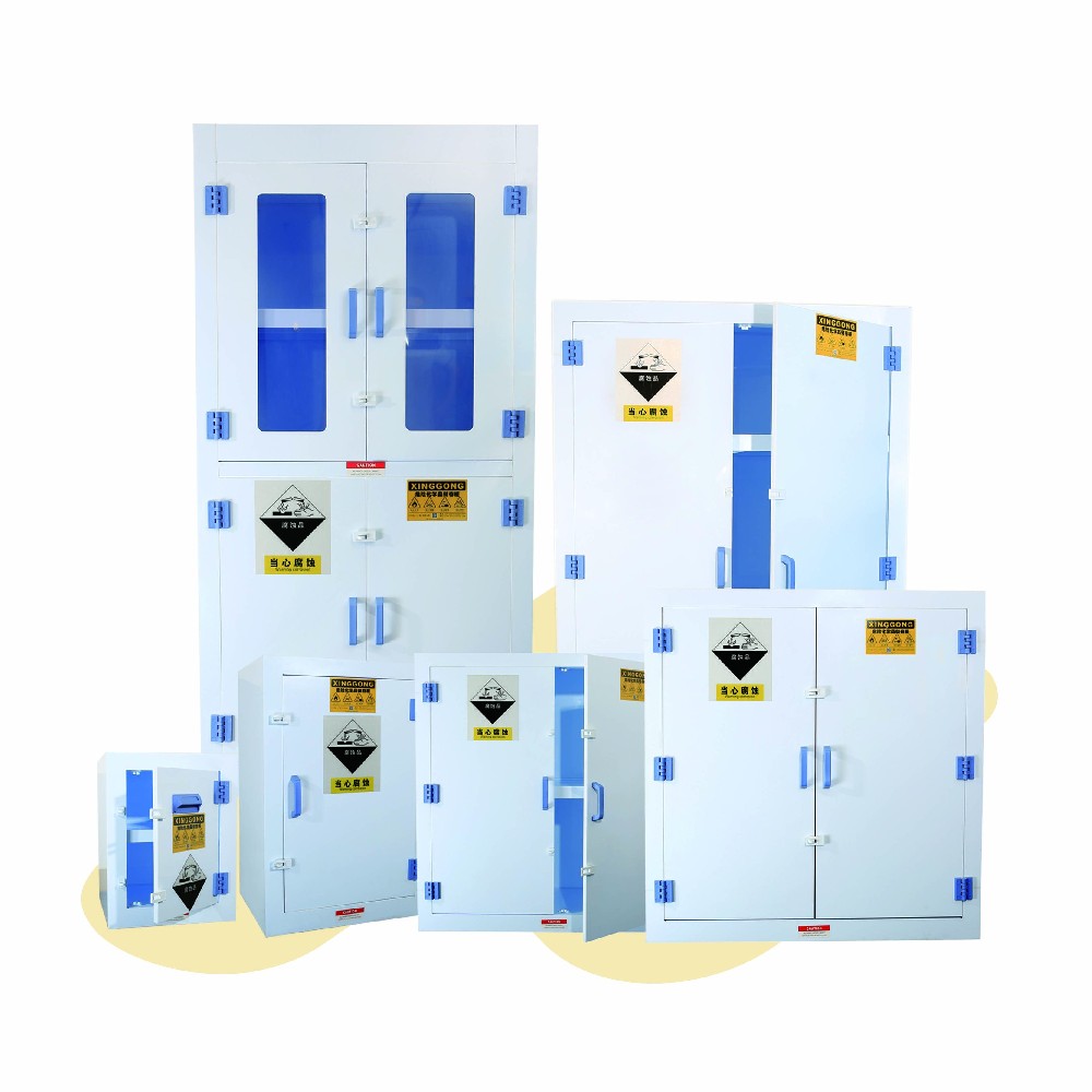 2、柜体采用耐强酸碱腐蚀的 8mm 厚瓷白色 PP 聚丙烯原料板制作,门框一体折弯成型,表面无焊缝,内置四根加强型 PP 立柱折弯一次成型,无缝焊接固定,结构坚固结实,承重性能优异;同时柜体下后部预留一排直径 10mm 进气口,方便以后安装排风,便于进气,柜体顶部预留蜂窝孔,便于以后安装排风管道。